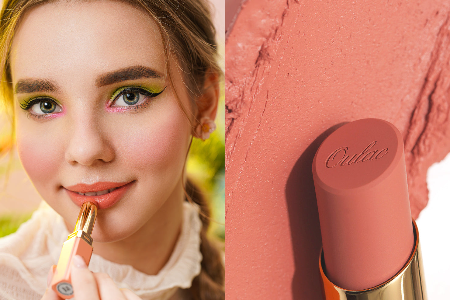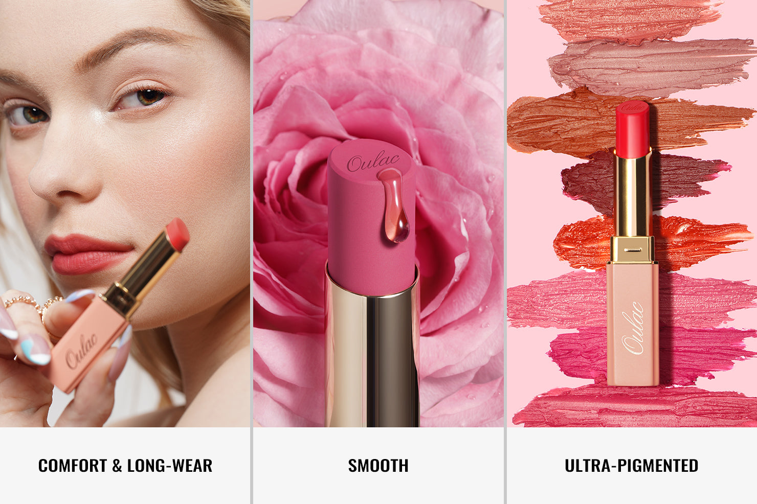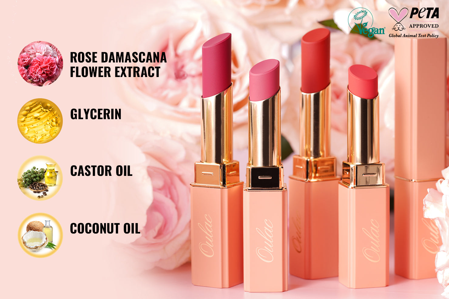 Oulac Velvet Matte Lipstick features natural ingredients for comfort and long-wear, with castor oil providing moisture and a smooth texture. It has a creamy, ultra-pigmented formula that offers a balance between a matte finish and hydration, ensuring vibrant, enduring color.