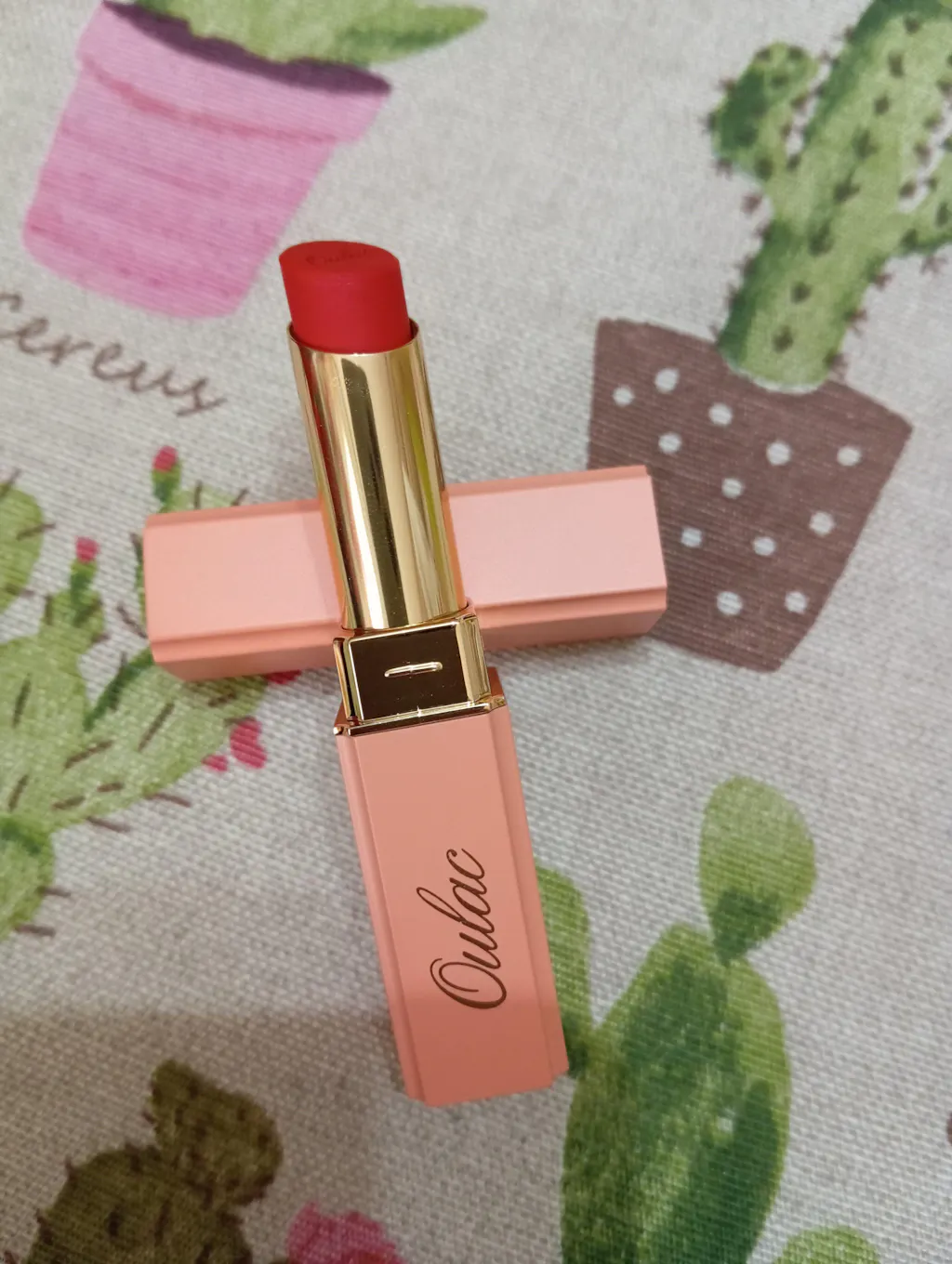 Oulac Velvet Matte Lipstick features natural ingredients for comfort and long-wear, with castor oil providing moisture and a smooth texture. It has a creamy, ultra-pigmented formula that offers a balance between a matte finish and hydration, ensuring vibrant, enduring color.